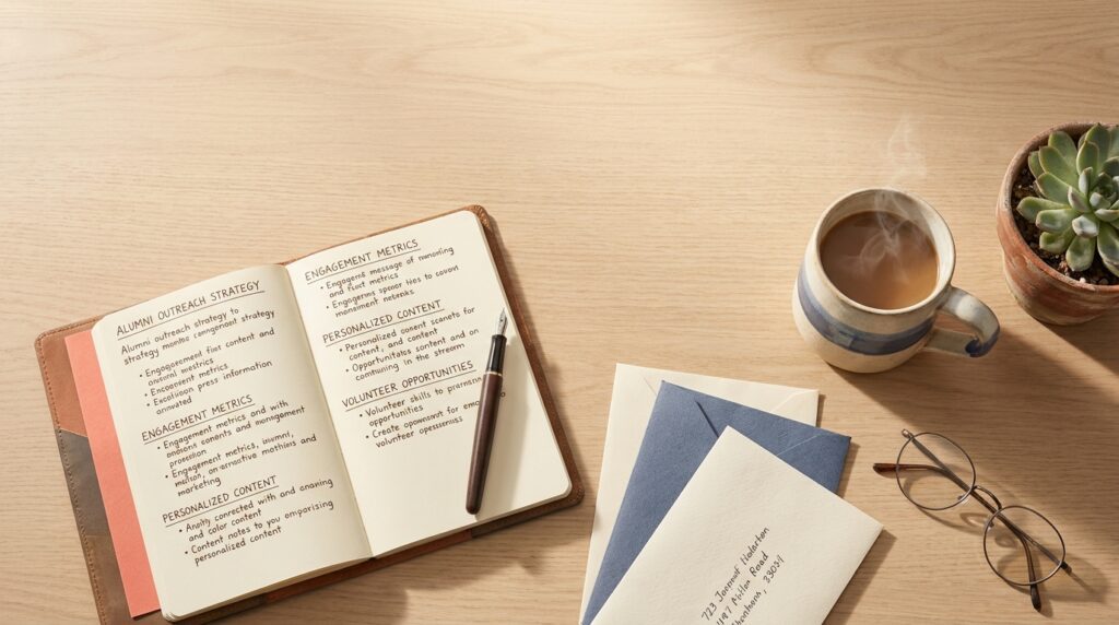 alumni email engagement planning overhead desk scene