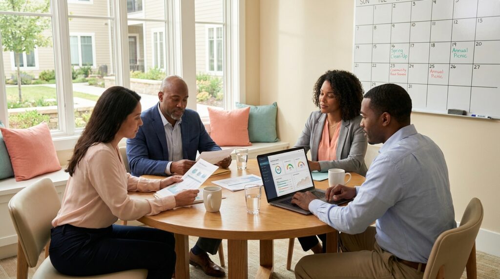 HOA board meeting with four diverse board members reviewing documents at a round table